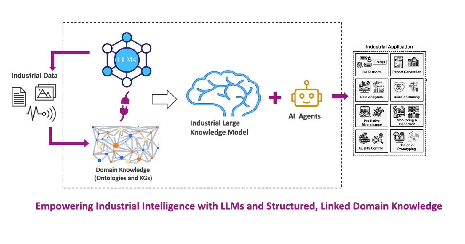 1)to develop methods for extracting multimodal industrial knowledge; 2)to formalize industrial knowledge in a structure and linked form using ontologies and knowledge graphs; 3)to integrate LLMs with this structured and linked domain knowledge; 4)to evaluate and validate the results through AI agents that solve practical industrial tasks.