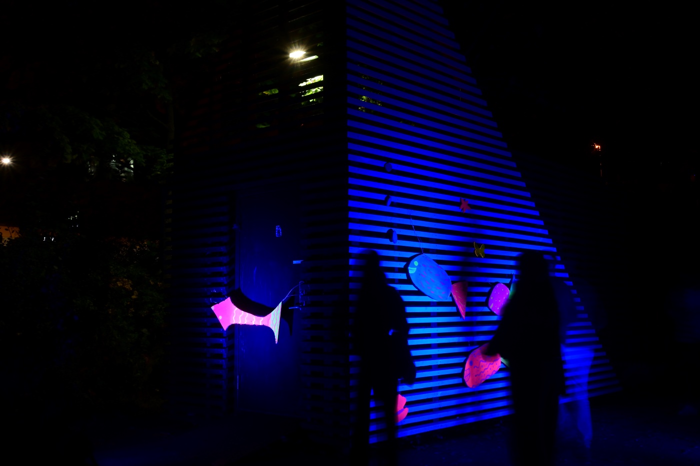 This year's theme for September Lights was water, and the students spread light over the pier, the marina and Hotellplan in Jönköping. Visitors were invited to walk along the marina and pier where, among other things, trees and ice cream stalls were illuminated in bright colors. Homemade jellyfish hung from lampposts, neon-coloured fish were displayed against a wall and illuminated water washed over the pier wall. Illuminated water lilies bobbed in the water and a diving woman was depicted with the help of flashing silhouettes at the lighthouse.