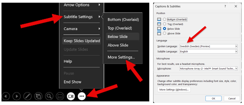 På samma plats finns också inställningen för vilket språk du vill att undertextningen ska vara på. Det kan vara samma språk som det talade språket men det går även bra att powerpoint automatöversätter till ett annat språk. Med andra ord kan du exempelvis prata svenska och få undertextningen på engelska, eller tvärtom.