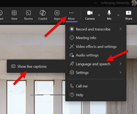 Gå till de tre prickarna i den övre menyraden och slå på undertextning. Ett fält för visning av undertextning öppnas. Till höger i det fältet finns ett kugghjul eller tre prickar som du klickar på för att komma till inställningarna för talat språk.