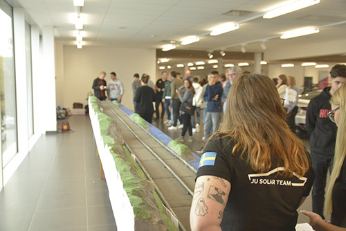 Förutom att sitta med i juryn visade JU Solar Team upp delar av sin solbil i full storlek och svarade på frågor från eleverna. De bygger solbilen själva och tävlar nästa år i Bridgestone World Solar Challenge i Australien.