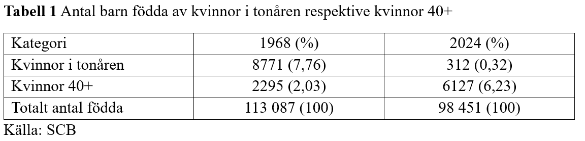 I nästa diagram tittar vi på perioden 1925–2024 och ser i stället på antalet födda barn per kvinna. Trenden är tydligt negativ och även här minskar variationen under de senaste åren. Födelsetopparna speglar perioder med ett större antal kvinnor i fertil ålder till följd av befolkningsutvecklingens cykliska mönster. Vidare tenderar avståndet mellan topparna att öka, vilket speglar ökad genomsnittsålder hos de kvinnor som föder barn. Vi kan exempelvis se att år 2023 var förstföderskornas medelålder 30,39 år, vilket kan jämföras med att den år 2000 var 28,22 år. Den ökade genomsnittsåldern hos de kvinnor som föder barn belyses tydligt i tabellen nedan som visar det antal barn som kvinnor i tonåren respektive kvinnor 40+ födde år 1968 respektive år 2024. Förändringen över tid kan bara beskrivas som dramatisk.