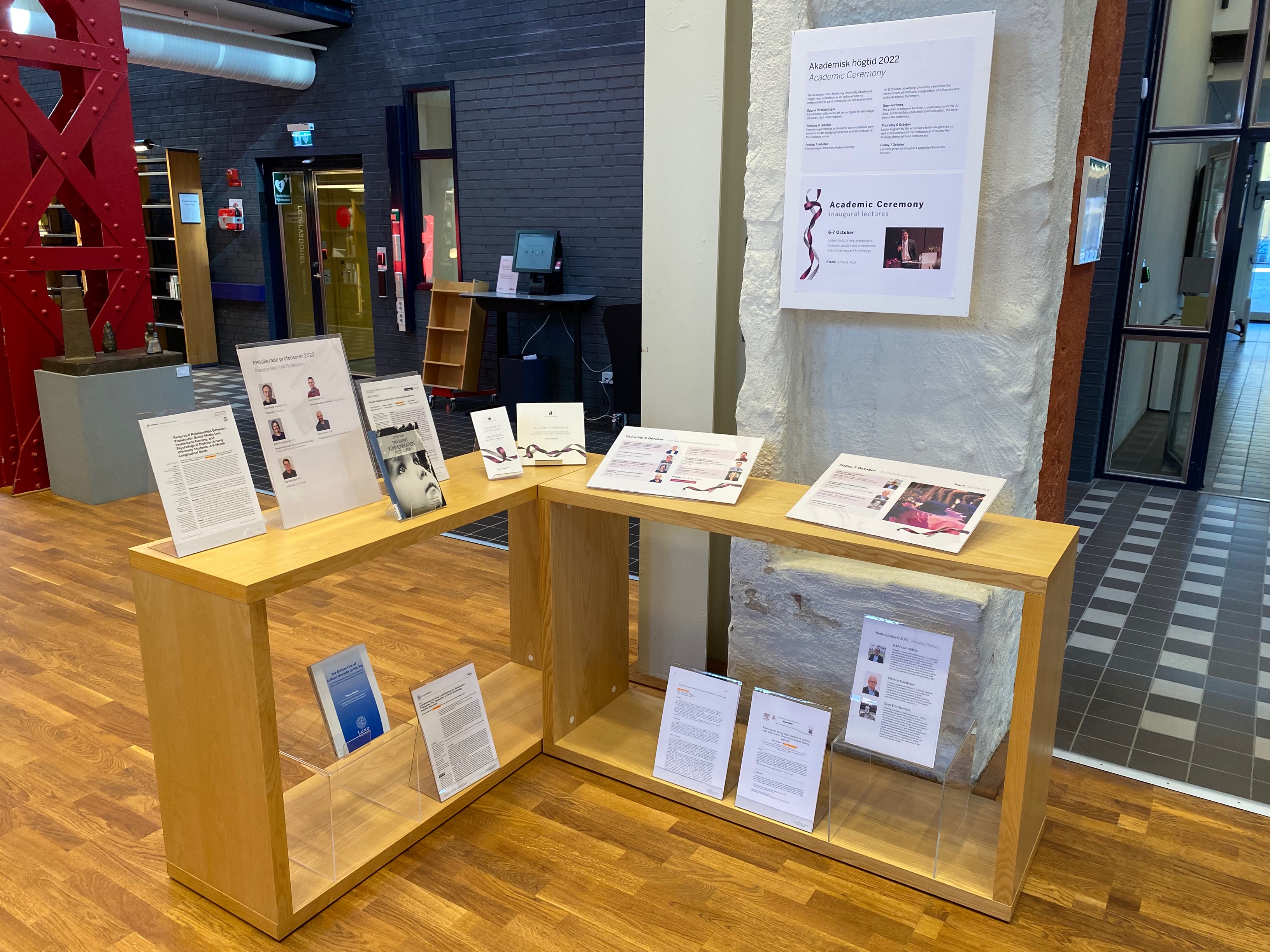 Vid årets Akademiska högtid kommer fem professorer att installeras och 26 doktorer och tre hedersdoktorer att promoveras. Förutom deras publikationer, kan du i utställningen även se några av de insignier som hör till ceremonin.