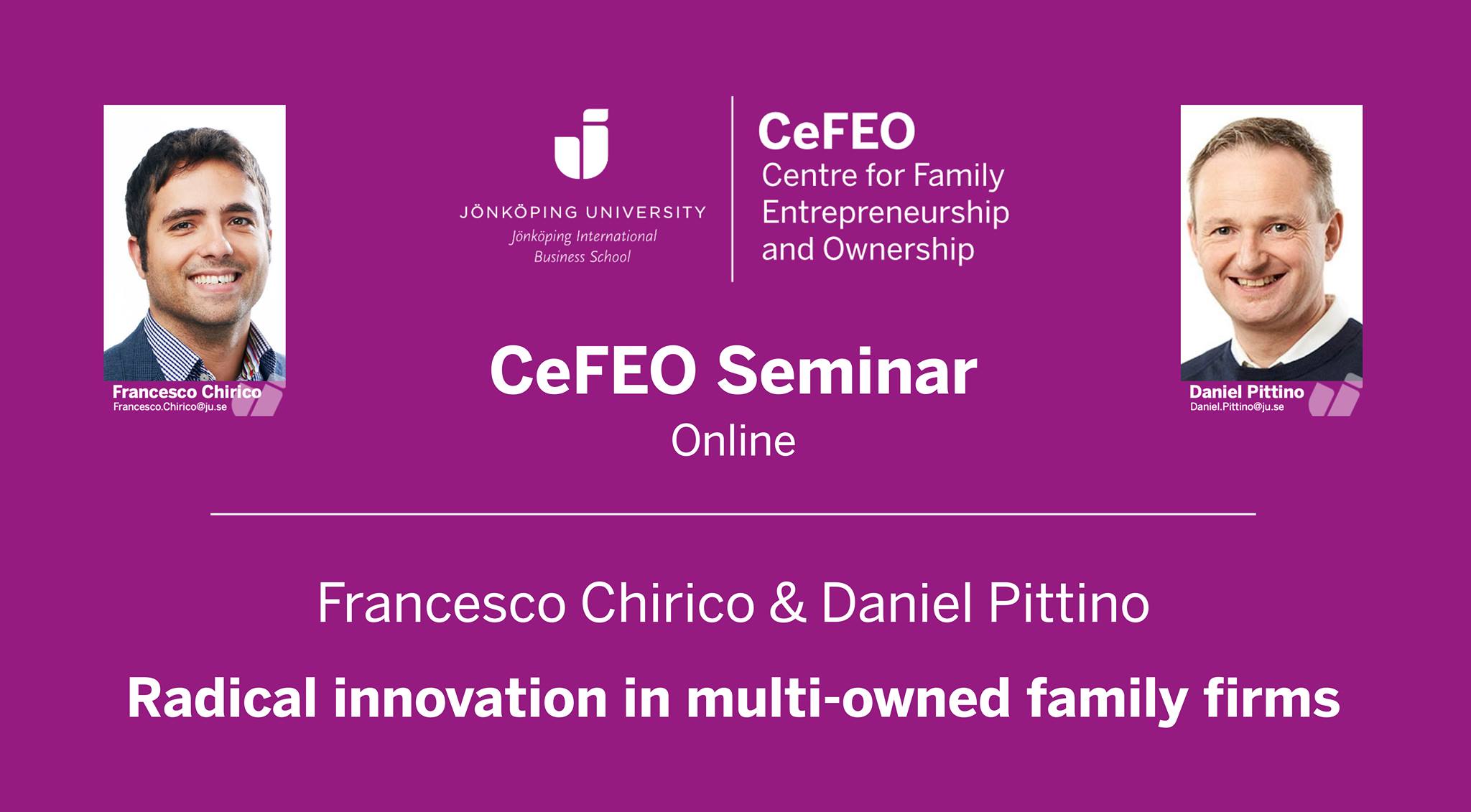 These difficult days offer opportunities for evolving and innovating our way to work. At CeFEO we are committed to supporting and boosting research education and outreach in family business and ownership. In a time when conferences and workshops are postponed, we would like to offer the opportunity to CeFEO members and colleagues in the field to join a series of research seminars that will be organised with a hybrid format, online via Zoom and (when possible) in person at JIBS.