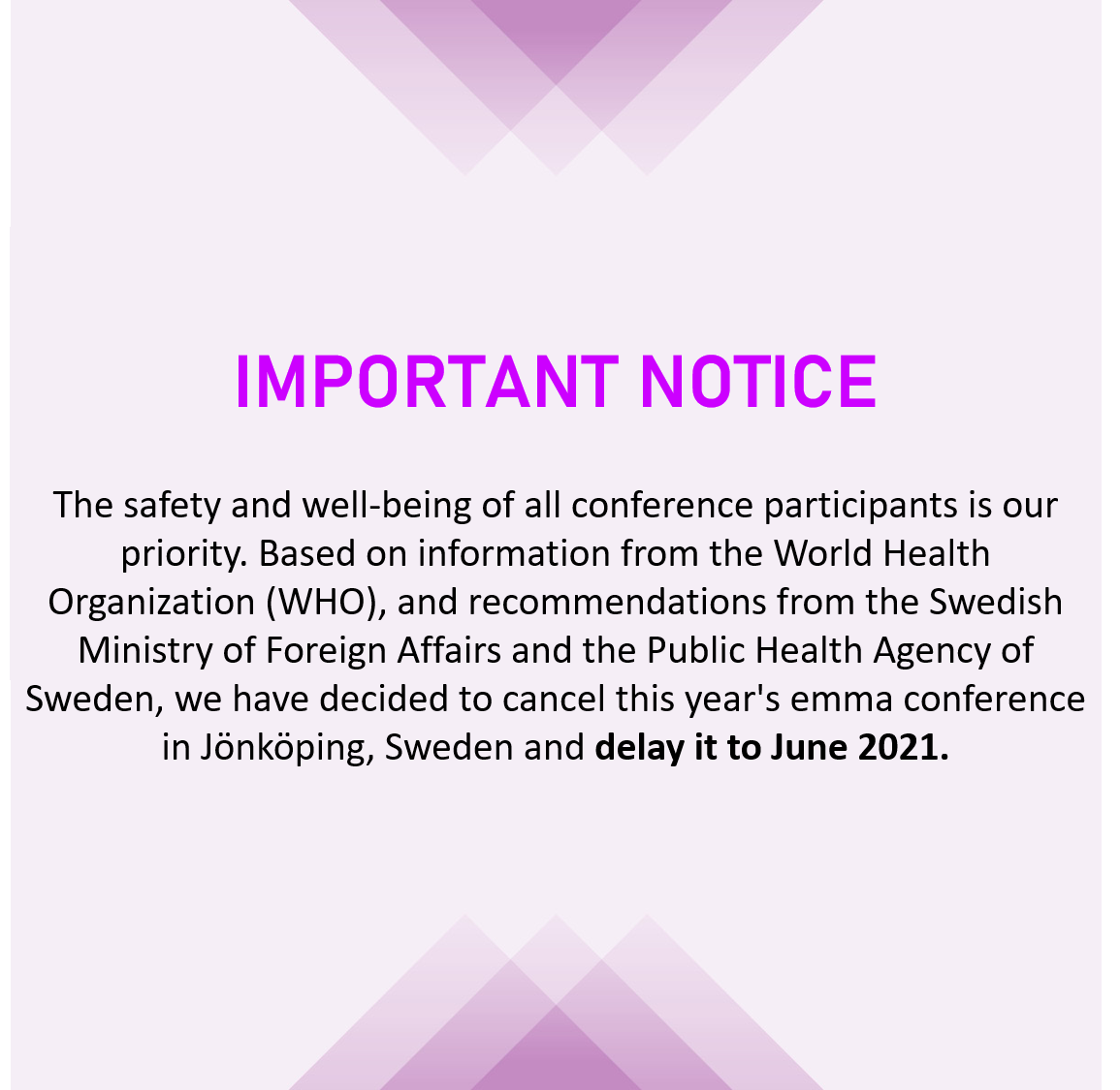 The safety and well-being of all conference participants is our priority. Based on information from the World Health Organization (WHO), and recommendations from the Swedish Ministry of Foreign Affairs and the Public Health Agency of Sweden, we have decided to cancel this year's emma conference in Jönköping, Sweden and delay it to June 2021.