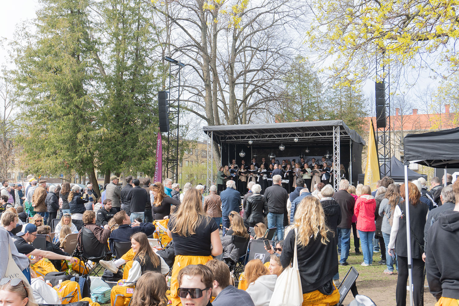 Måns Svensson, the newly appointed president of Jönköping University, delivered his first spring address to the cheering crowd. The celebrations concluded with more choir singing and a speech by Jose Alvarado, president of the Jönköping Student Union. Afterward, the student union hosted activities with competitions, music, and a DJ.