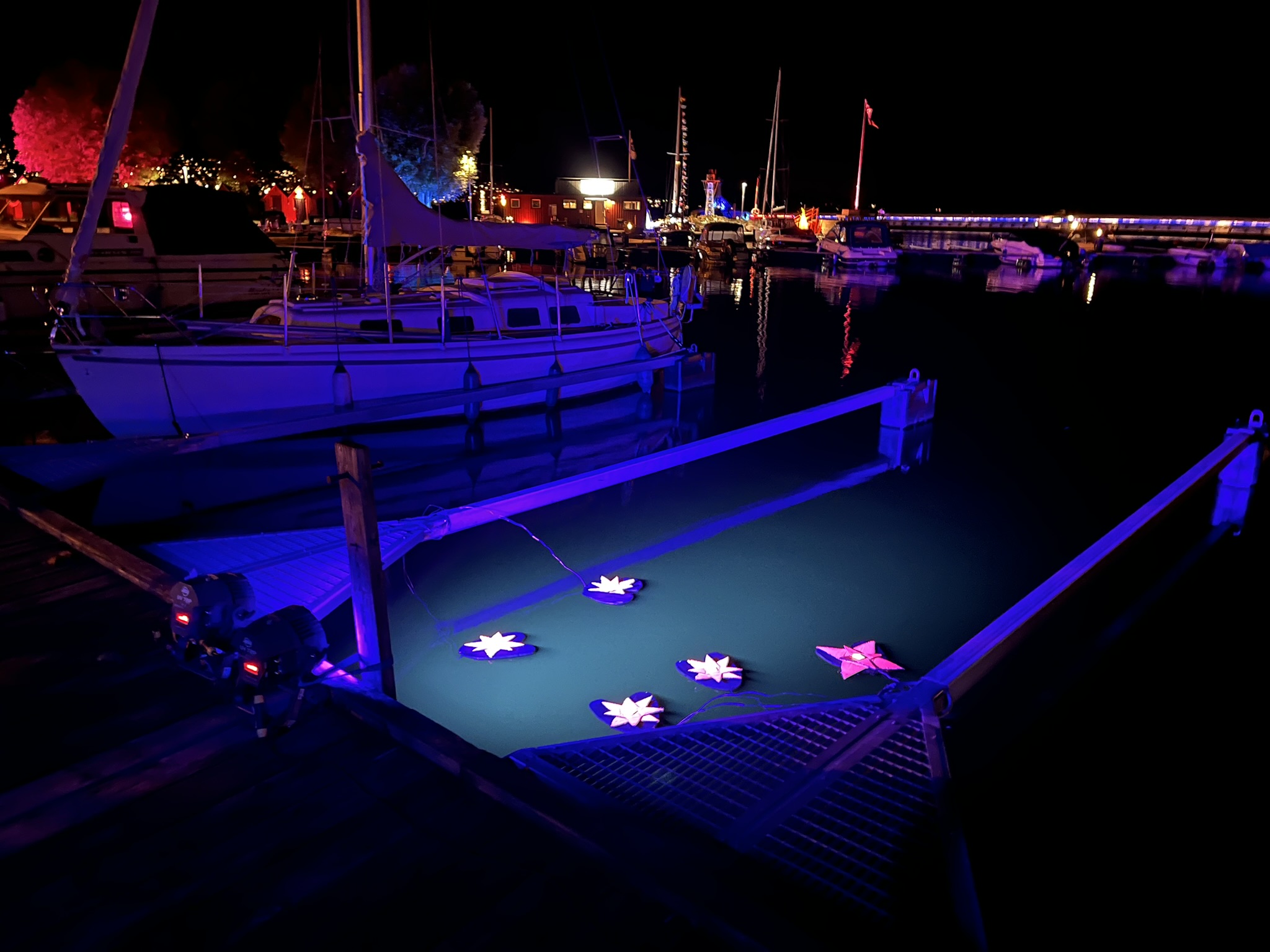 This year's theme for September Lights was water, and the students spread light over the pier, the marina and Hotellplan in Jönköping. Visitors were invited to walk along the marina and pier where, among other things, trees and ice cream stalls were illuminated in bright colors. Homemade jellyfish hung from lampposts, neon-coloured fish were displayed against a wall and illuminated water washed over the pier wall. Illuminated water lilies bobbed in the water and a diving woman was depicted with the help of flashing silhouettes at the lighthouse.
