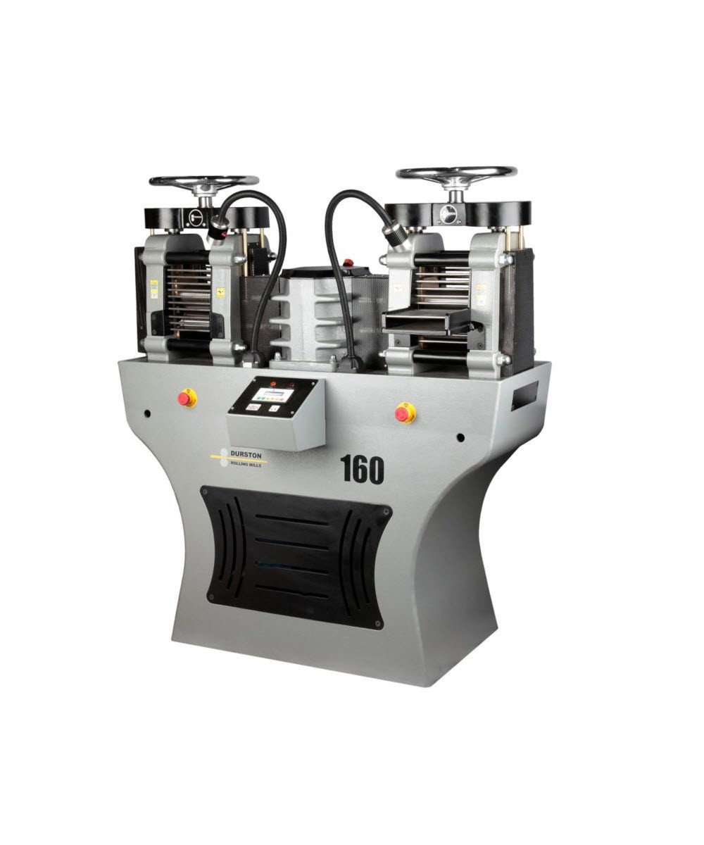 Powered Rolling Mill – FSM 160 – Double Sided from Durston Tools. The FSM 160 Double-Sided Power Mill is constructed from cast iron for optimal strength and rigidity. The mill is available in two-speed configurations; fixed speed and variable speed. There is also a computer control panel which offers more information such as roll speed, pressure, oil indicator and light work. This mill is floor standing and offers automatic lubrication to the roller bearings, 160mm of flat roll area and 22 square grooves.