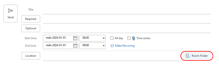When a new meeting appointment is opened, the Room Finder button is found after Location.