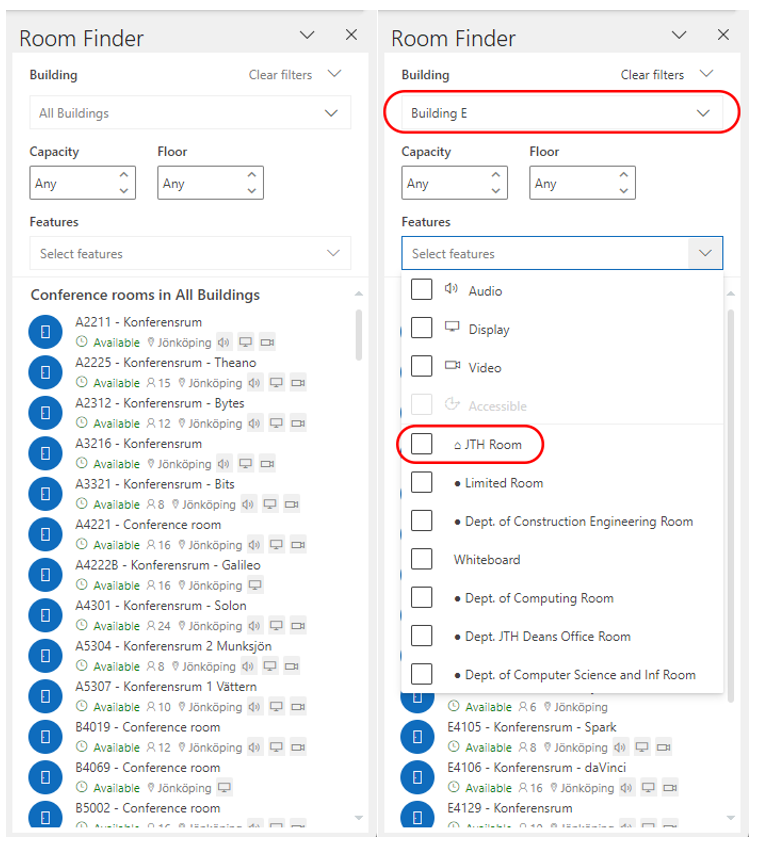 Here you can filter on different values. In the picture, building E is selected and under Features there are values for filtering the rooms by equipment but also who has permission to book the room. If you select ⌂ JTH Room, only rooms that all staff at JTH can book are displayed. If you belong to a department that have its own rooms, you can select your department to see only these rooms. Limited Room means that only a small group of people can book the room and the room is not connected to a company or department.