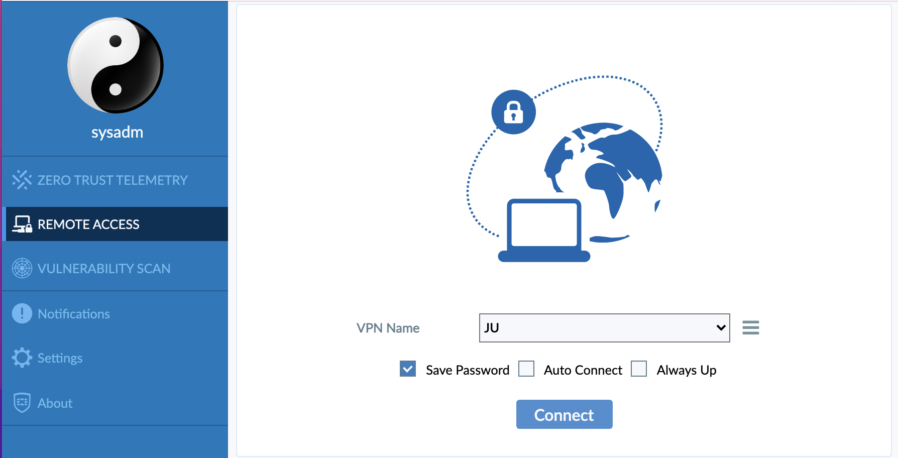 (Not applicable at the moment - Go to the page https://vpn.ju.se External link, opens in new window. and click on "Single Sign-On". Log in with your JU account (email address).)