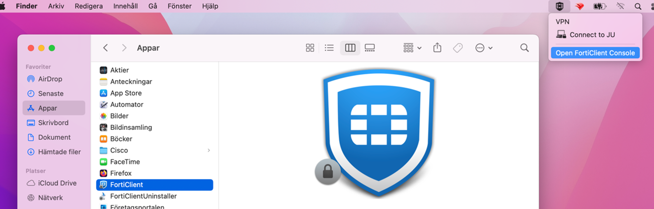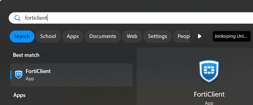 Most JU computers have the VPN client installed. Open the Start menu and search for FortiClient. FortiClient normally starts automatically and then has an icon in the system tray. If FortiClient is not installed, it can be installed from "Företagsportalen" ( "Company Portal") found in the start menu, when you've started Företagsportalent search for FortiClient. If this is the first time you start Företagsportalen, you need to choose the type of device you are using. If it is a JU computer (PC), select JU Employee Windows PC.