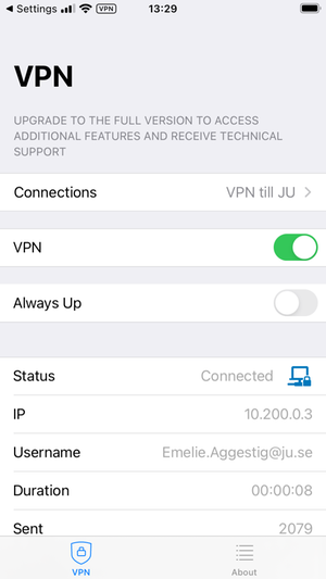 Connect by tapping on the VPN slider in the app. When you are connected it will look like this. Disconect by tapping on the slider again.
