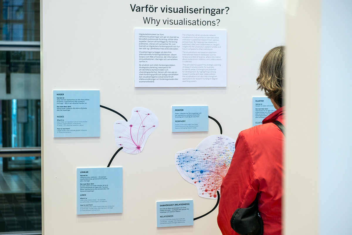 The University Library produces visual maps that show how research is published, cited, and interconnected. These visualisations are not only part of the exhibition but are also used by research environments to identify strengths and analyse development potential. By showcasing a strong research profile and clear collaborations, the visualisations can also help strengthen applications for research funding or degree-awarding powers.