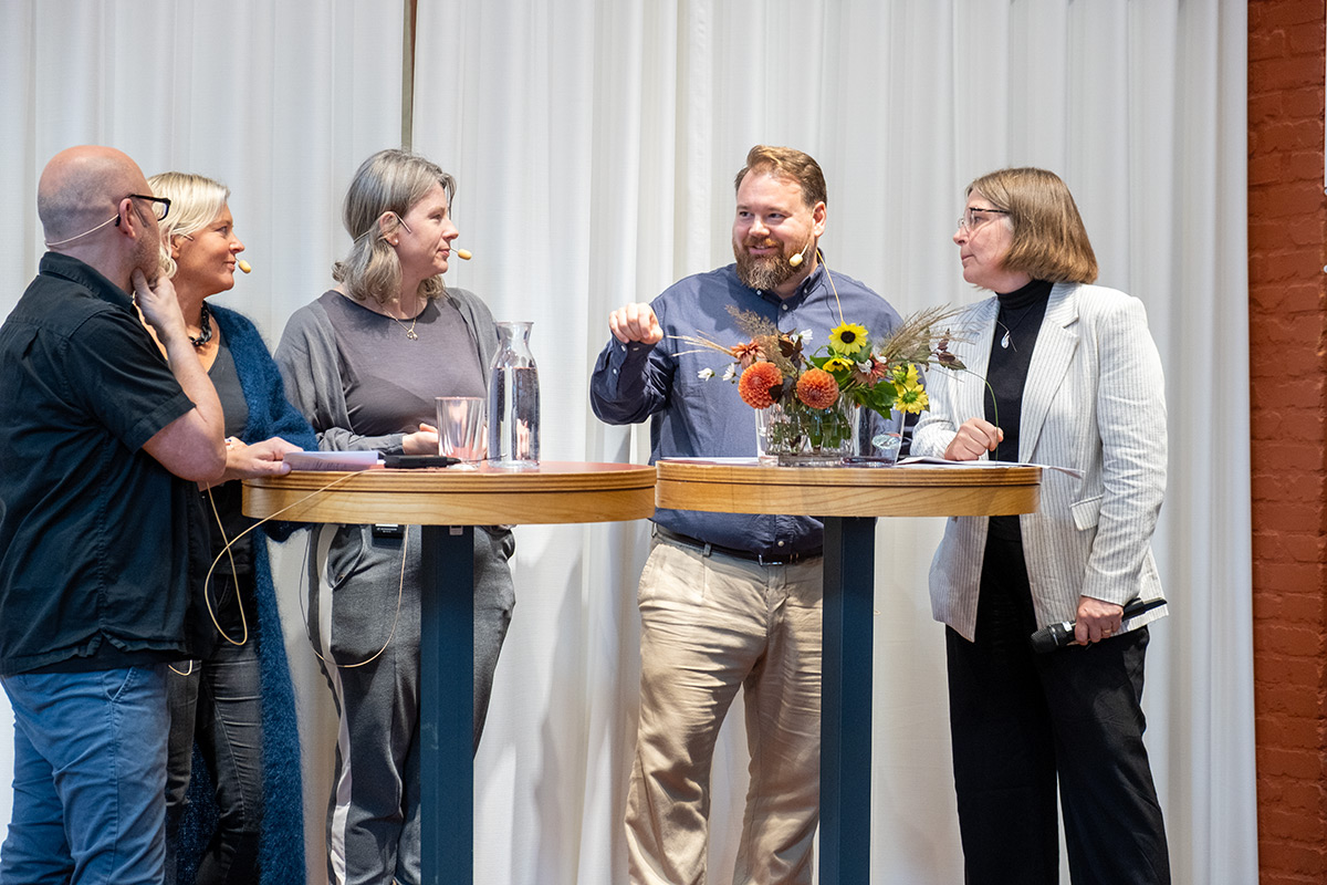 Den 16 september invigdes Högskolebibliotekets nya utställning ”Forskning i färg – en visuell resa genom 30 år av vetenskaplig publicering vid Jönköping University”. Genom färgstarka visualiseringar får besökare en unik inblick i hur forskningen vid högskolan har vuxit, förändrats och blivit alltmer sammanflätad sedan Stiftelsen Högskolan i Jönköping bildades 1994. Rektor Måns Svensson invigningstalade och det följdes av ett panelsamtal med representanter från alla fackhögskolor.