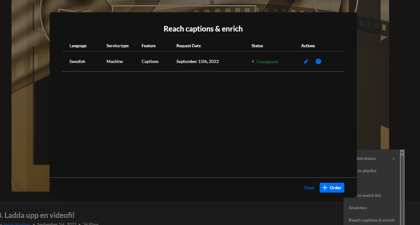 Det tar en stund innan din textfil är klar men du blir meddelad via e-post när den är redo för dig att granska och eventuellt redigera i. Du ser status för din beställning i samma fönster där du beställt textningen. När din textning är klar kan du i samma fönster klicka på ikonen som ser ut som en penna för att komma till redigeringsverktyget.