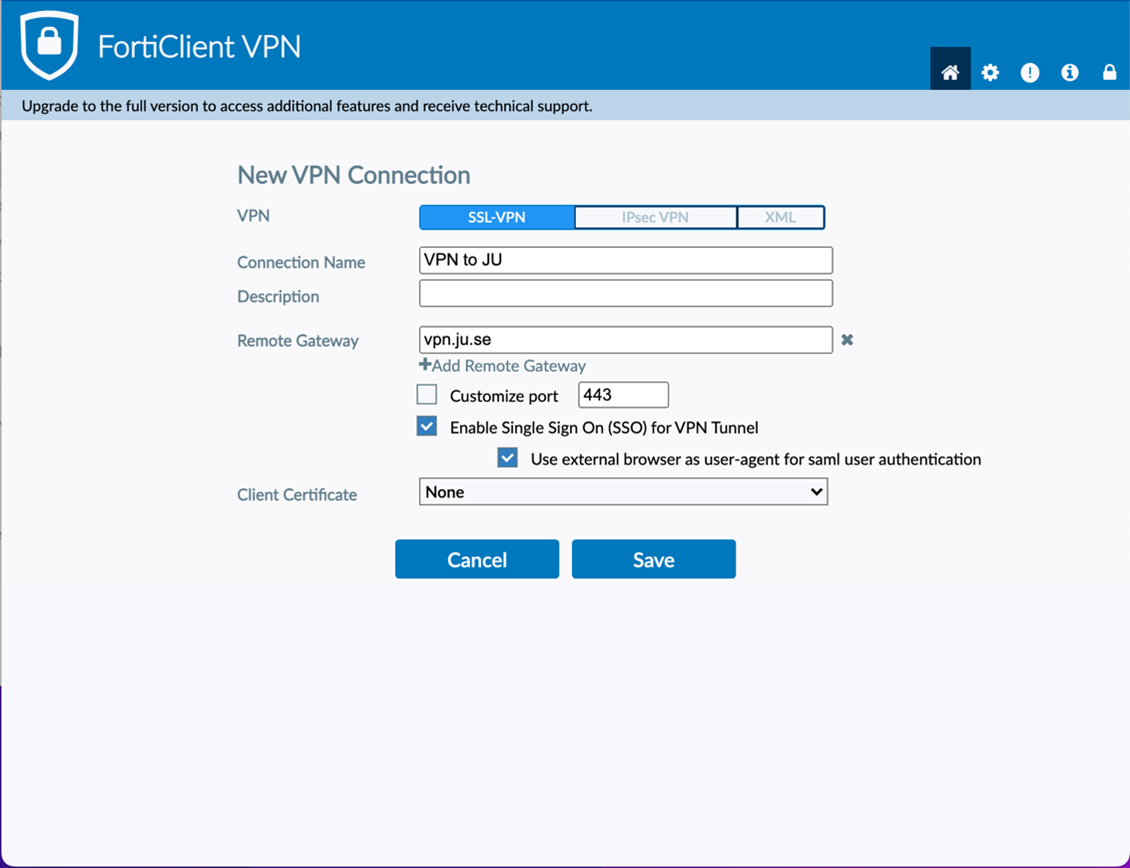 På en privat dator, behöver den fria varianten av FortiClient VPN installeras. Följ stegen nedan.