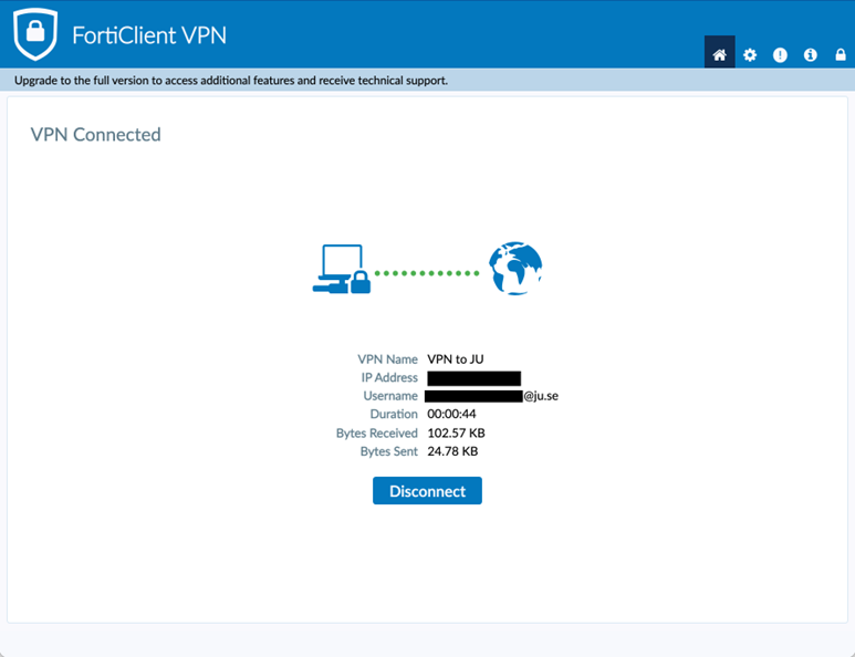 När du är uppkopplad ser det ut enligt nedan. Inaktivera genom att klicka på Disconnect.