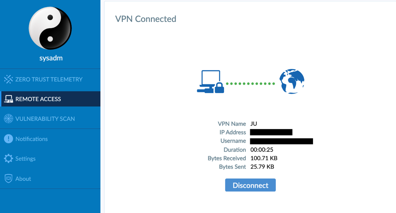 När du är uppkopplad ser det ut enligt nedan, klicka på Disconnect om du inte längre vill vara uppkopplad mot VPN.
