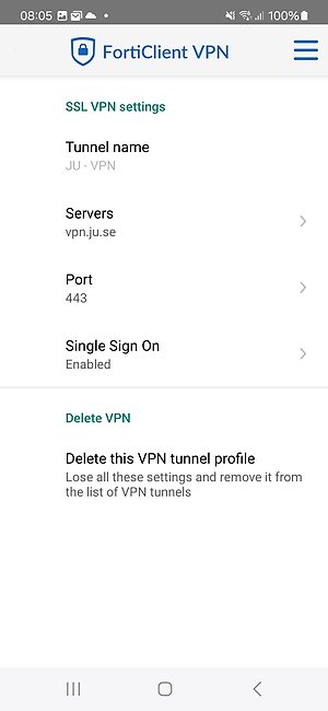 På JU-hanterade mobila enheter distribueras FortiClient VPN automatiskt. Ladda ner appen FortiClient VPN via AppStore eller via ”Play Butik” om du använder en privat enhet.