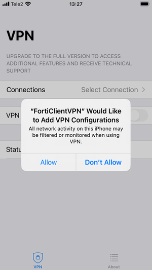 Klicka på Acceptera/Accept på frågan om support (finns bara ett val). Tillåt eller neka notiser som du vill. Tillåt att appen lägger till VPN-konfigurationer.