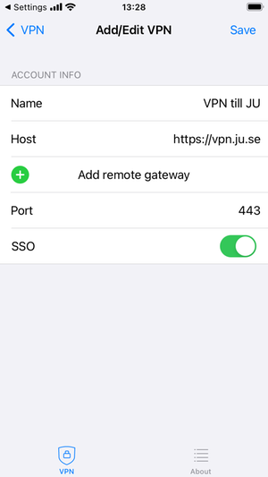 Efter att du har konfigurerat din profil och anslutit en gång kommer du kunna kryssa i rutan Save Password för att kunna logga in snabbare nästa gång.