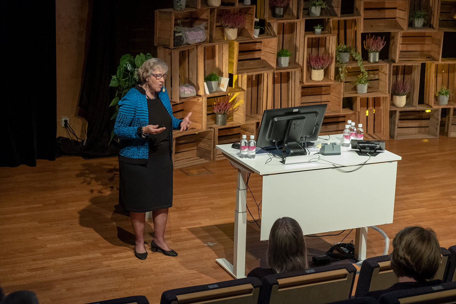 Gwen Sherwood, hedersdoktor vid Hälsohögskolan och professor emerita, höll sin föreläsning om Glädje under resan: Reflekterande praxis för att förbättra resultaten inom patientvården (Joy in the Journey: Reflective Practices to Improve Patient Care Outcomes)