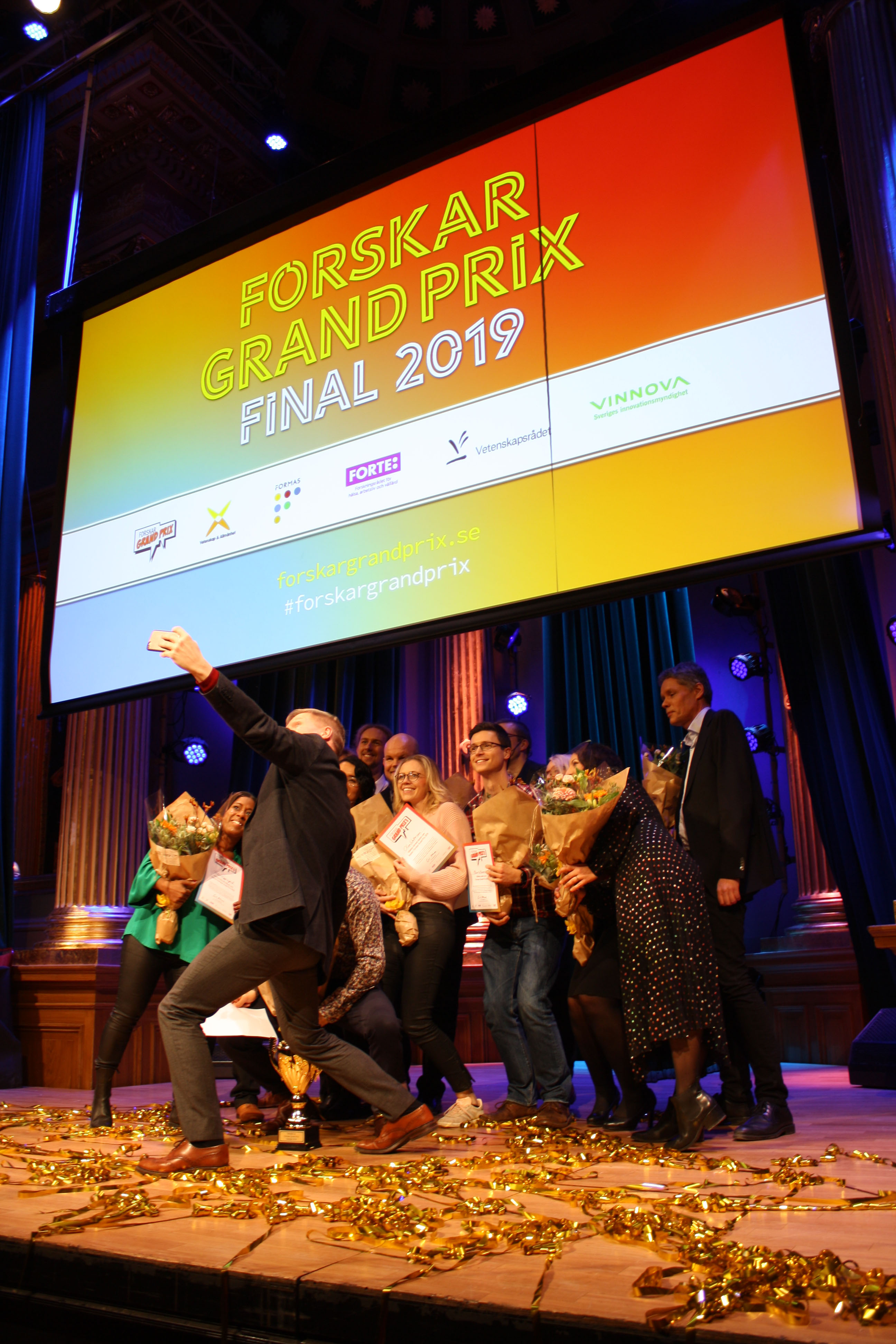 Alla finalister tillsammans på scenen efter Forskar Grand Prix 2019.