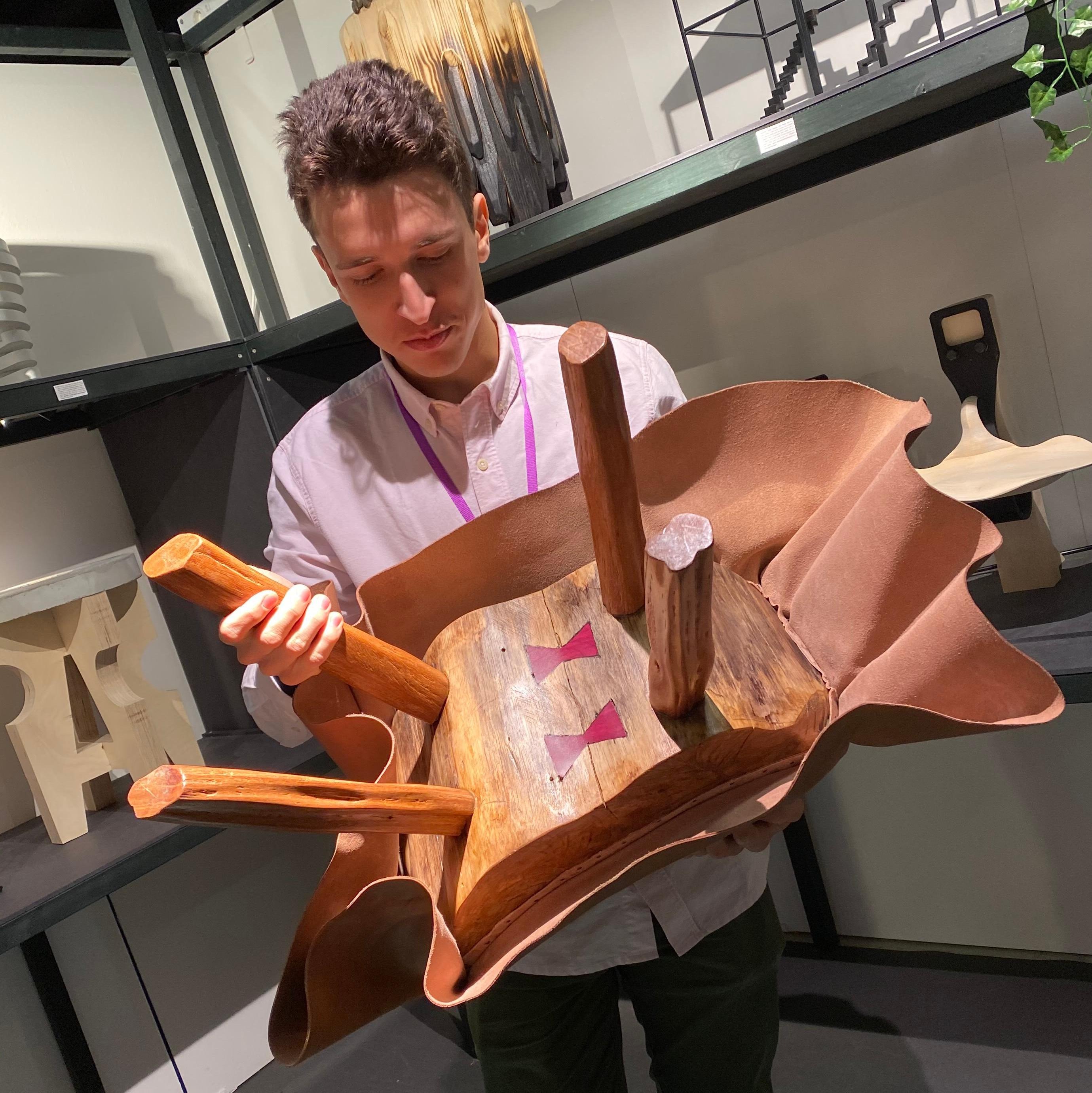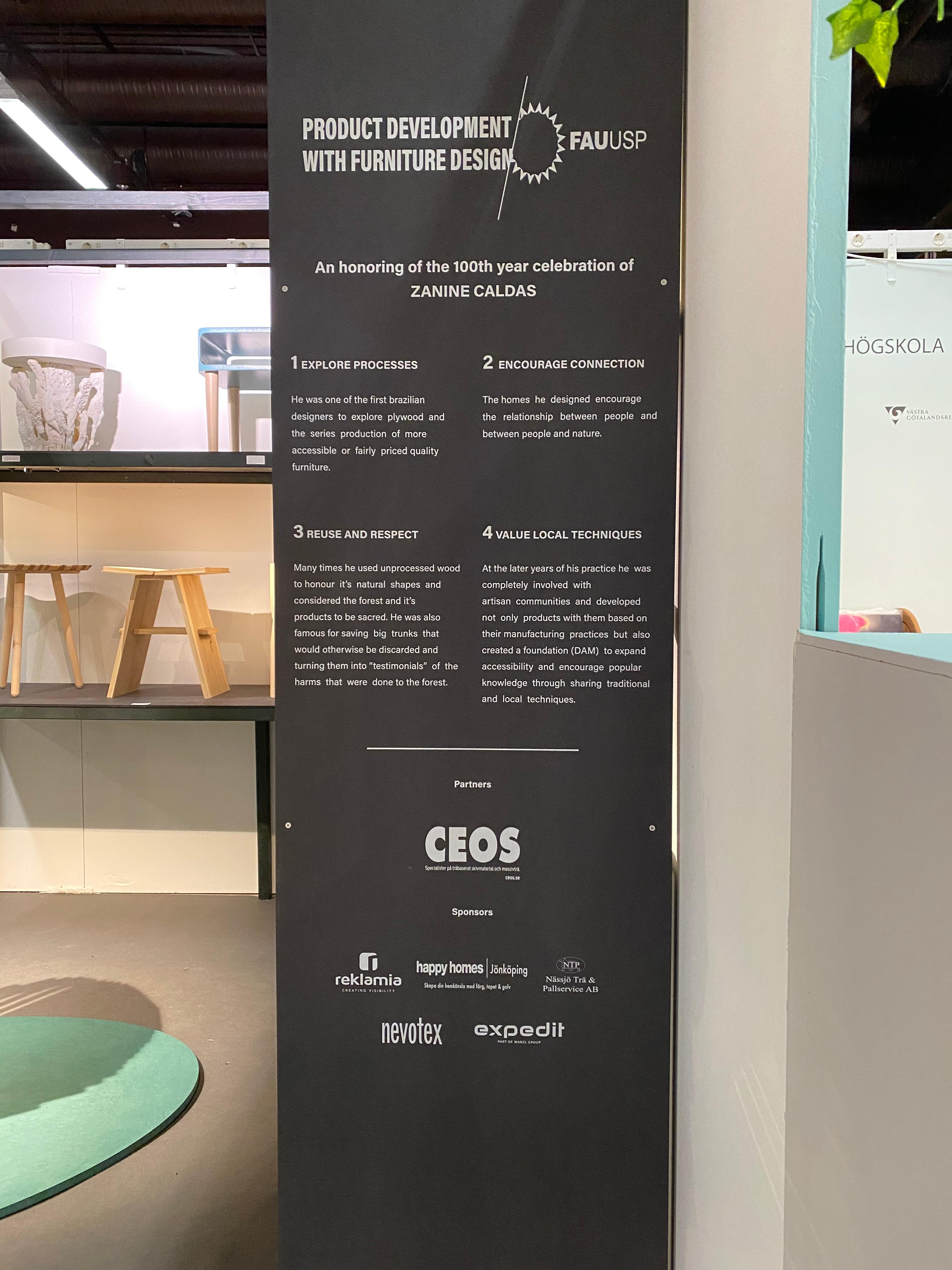 Möblerna som på bilderna syns uppställda på golvet i montern är en del av andraårsstudenterna på PUMs utbildning och hyllar den kände möbeldesignern Zanine Caldas från Brasilien, som skulle ha fyllt 100 år 2019.