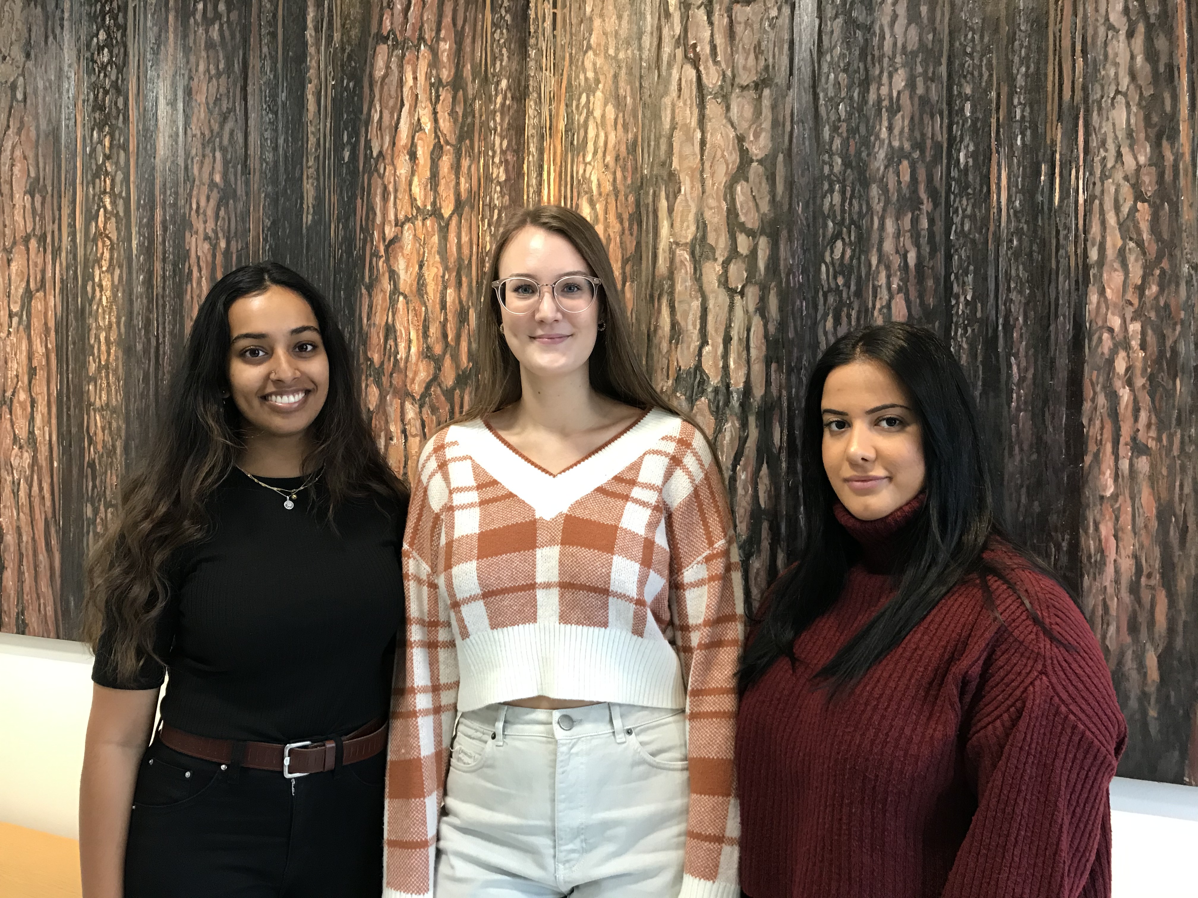 Från vänster: Studenterna Aloika Basu, Emelie Holmström och Juliana Babana som spenderat två lärorika veckor med att lära sig mer om varandras professioner på KUM.