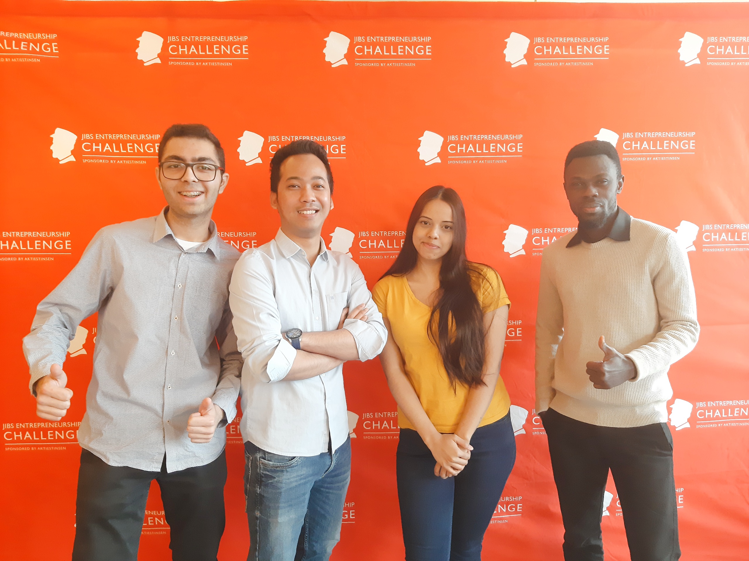 Vinnarna av JIBS Entrepreneurship Challenge 2021, från vänster: Ishaan Chandok, Eko Wahyu Kuncoro, Devika Dileep och Raphael Lauren Owusu. "Vi vill ge bort en del av våra prispengar till välgörenhet, i sann social entreprenörskapsanda,"