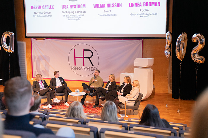 Ett väldigt uppskattat inslag på HRID genom åren är panelsamtalet med alumner från HR-programmet som nu jobbar med HR. I år medverkade Jesper Carlek från Norma Group, Lisa Nyström, Jönköpings kommun, Wilma Nilsson, Sesol och Linnea Broman, Poolia. Panelen fick frågor som hade kommit in från studenterna och de diskuterade både karriärmöjligheter och gav tips och lärdomar.