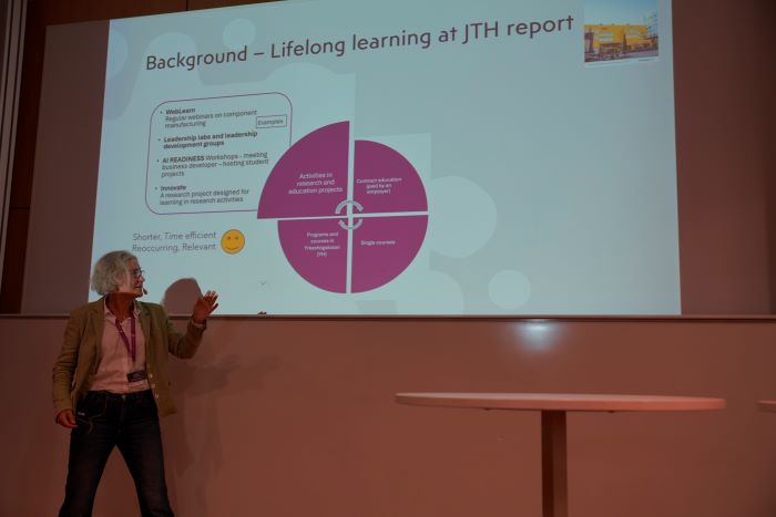 Under konferensens eftermiddag presenterade JTH:s forskare olika projekt på temat livslångt lärande. Bland andra professor Ehsan Ghassemali som berättade om projektet CIRCUMET där JTH utvecklar kurser för livslångt lärande kopplat till metalliska komponenter i en cirkulär värdekedja, och Madelene Zetterlind, universitetsadjunkt, som informerade om vilka möjligheter det finns till livslångt lärande i olika forskningsprojekt i samverkan med företag.