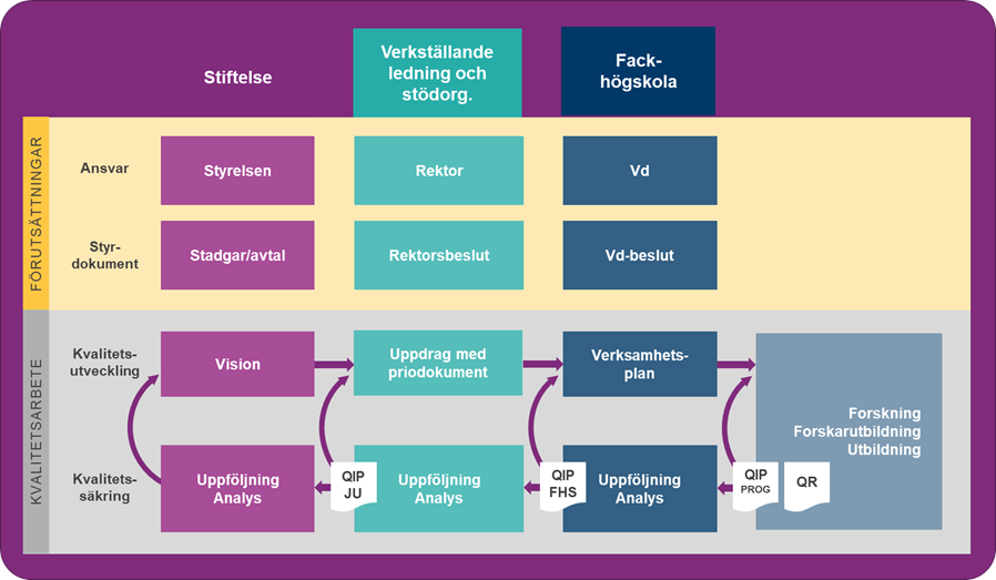 - kvalitetsutvecklingsplanerna inom respektive fackhögskola sammanfattas till en övergripande utvecklingsplan för hela fackhögskolans forskning respektive utbildning (QIPFHS), och dessa är underlag till fackhögskolans verksamhetsplan,