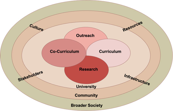 EEU som ett koncept framkom från äktenskapet mellan idéer om entreprenörsekosystem och utbildningens ekosystem. Medan idén om entreprenörsekosystem har surrat bland entreprenörsforskare under en längre tid, med ursprungligt fokus på att förstå rollen som entreprenörsekosystem för framgången för vissa industrier eller entreprenörskap mer generellt, uppstod idén om utbildningens ekosystem i början av 1990-talet som ett sätt att fundera på hur högskolor fungerar i sin miljö, vilket gör det möjligt för studenter att interagera i en blandad miljö där tid, plats och utrymme ständigt förändras. Följaktligen kan EEU förstås som flerdimensionella undertagning som stöder entreprenörsutveckling genom en mängd olika inbördes relaterade aktiviteter relaterade till undervisning, uppsökande och forskning och visualiseras som i figur 1.