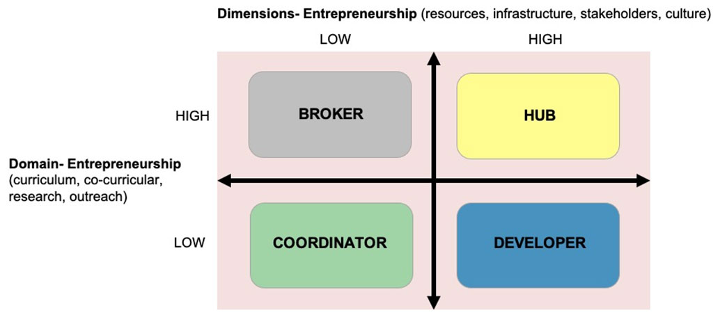 EEU kan ha olika storlek och form beroende på dess strategiska betydelse, plats och tillgänglighet av stödjande sammanhang. Mer specifikt kan universitet variera vad gäller deras fokus - undervisar vi bara entreprenörskap eller forskar vi om entreprenörskap också, ger stöd till lokalsamhället, uppmuntrar studentinitiativ eller engagerar vi oss i alla - och sammanhang. Att förstå domänen - där entreprenörskap finns på campus - är viktigt och påverkar den roll som universitetet kan spela i sitt ekosystem. Finns entreprenörskap överallt på campus eller koncentrerat till en eller några avdelningar eller centra? Hur mycket är forskning och undervisning sammanlänkade? Är vi bara intresserade av kunskapskapande eller även kommersialisering? Är lokalsamhället och alumner aktiva i aktiviteterna på campus? På samma sätt är det viktigt att förstå sammanhanget med kultur, infrastruktur, resurser och intressenter för att förstå hur entreprenörskap uppfattas. Vilka är normerna och värderingarna, incitamenten och traditionerna och hur förstärker eller avskräcker dessa entreprenörskap? Vem bedriver entreprenörskap och hur skådespelarna kopplas samman? Vilka resurser (när det gäller utrymme, teknik, tid, material) finns tillgängliga och för vem?