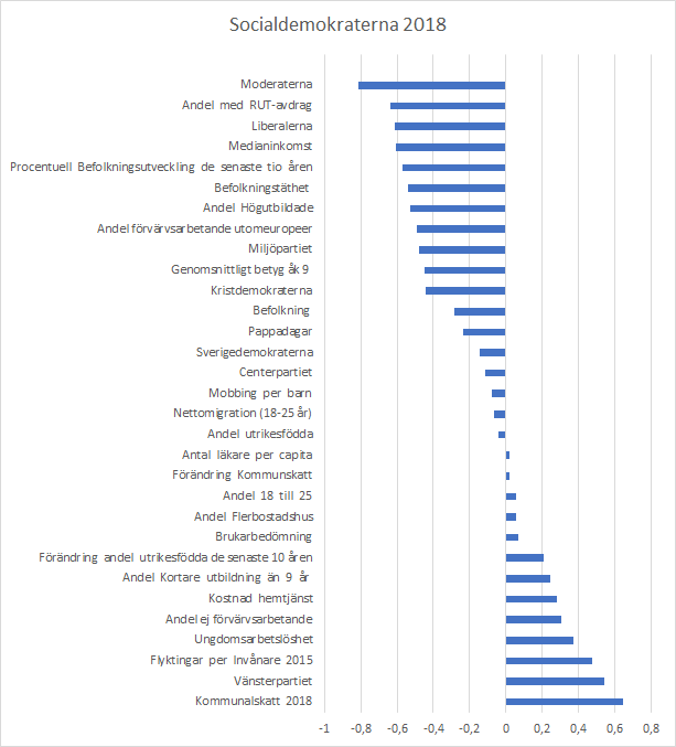 Låt oss därefter se hur valresultatet 2018 relateras till våra socio-ekonomiska faktorer: