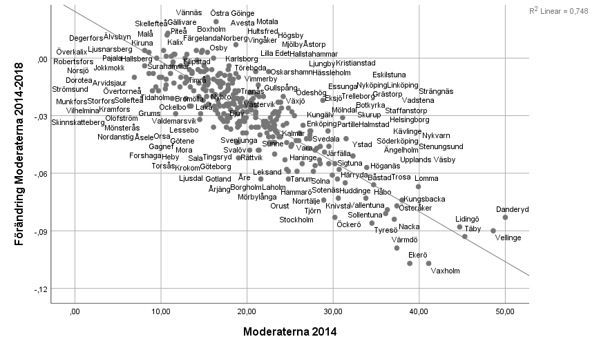 Figuren visar tydligt hur partiet tappat flest procentandelar i kommuner där de 2014 fick en högre andel av rösterna. Korrelationen är -0,865 och signifikant.