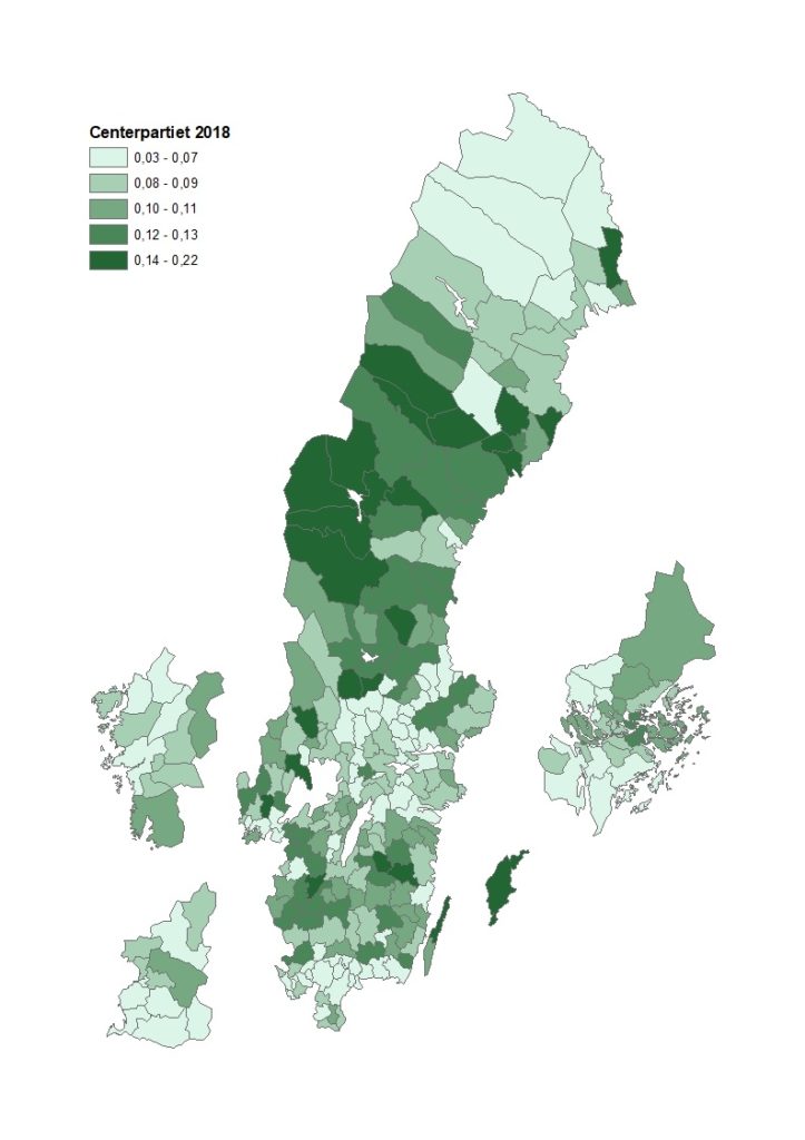 Centerpartiet är starkast i kommuner där man gett ett högt betyg i brukarbedömningen av hemtjänsten, där kommunalskatten är hög och där man i högre grad röstar på Kristdemokraterna. Partiet har ett svagare stöd i kommuner där befolkningstätheten är hög, där det finns en högre andel flerbostadshus, där man har en högre andel utrikesfödda och där fler röstar på Sverigedemokraterna.