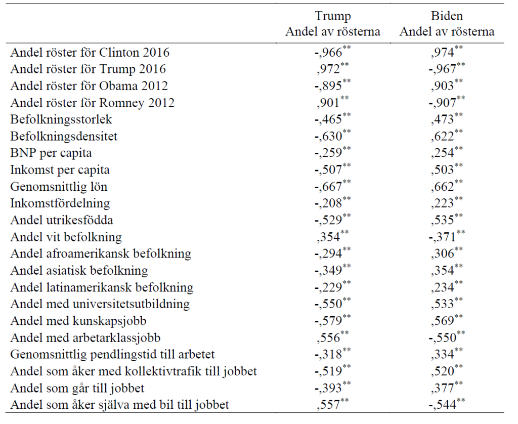 Men om vi tittar på samtliga metropolitan regions på en gång (dvs. samtliga med 50000 invånare eller fler) – vad kännetecknar då regionerna som i högst grad gett sitt stöd till Biden resp. Trump? För att ge en snabb överblick gör vi en korrelationsanalys. Det är viktigt att betona att en korrelation aldrig kan påvisa att det finns ett orsakssamband. Dock ger det en snabb indikation på vad som kännetecknar regionerna. En korrelation kan gå från -1 till 1. -1 innebär att det finns ett mycket starkt samband, men som är negativt, dvs. ökar stödet för en kandidat, minskar den variabel vi jämför med. Värdet 1 visar också att det finns ett starkt samband, men att relationen nu är positiv – dvs. ökar stödet för en kandidat så ökar också den variabel vi jämför med. Ju närmre siffran 0 desto mer troligt att det inte finns något signifikant samband mellan de båda variablerna (här andelen som stödjer en viss presidentkandidat och en annan variabel). För att markera att korrelationssambandet är signifikant så brukar vi markera ut med * eller **, där det senare indikerar att starkare samband än det första.