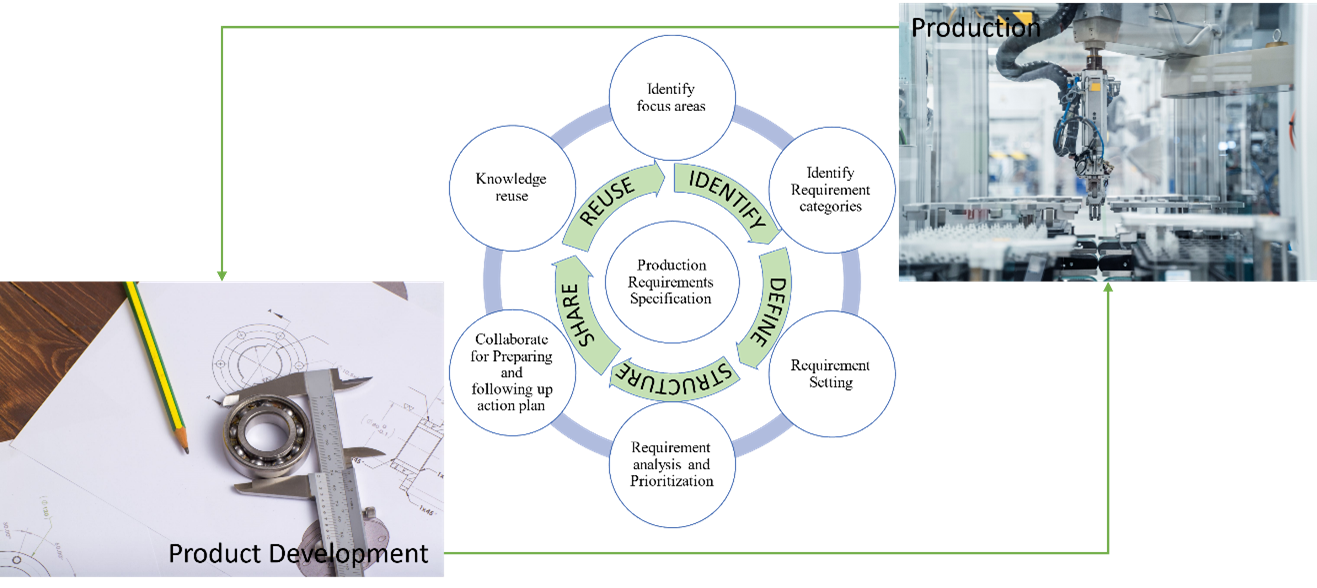Data analysis from partner companies highlighted that there was a lack of support for production engineers to present their requirements to the design engineers. Support was needed to guide the production engineers to identify and define the requirements, and structure and share them with concerned stakeholders. For the design engineers, the innovation needed not to be constrained in the initial phases. This meant that a method to work with production requirements should consider product and production maturities while providing opportunities for collaborative decision-making for requirement analysis, prioritisation, and knowledge sharing. It is also vital to support the reuse of these requirements as the process is time intensive and time is money.
