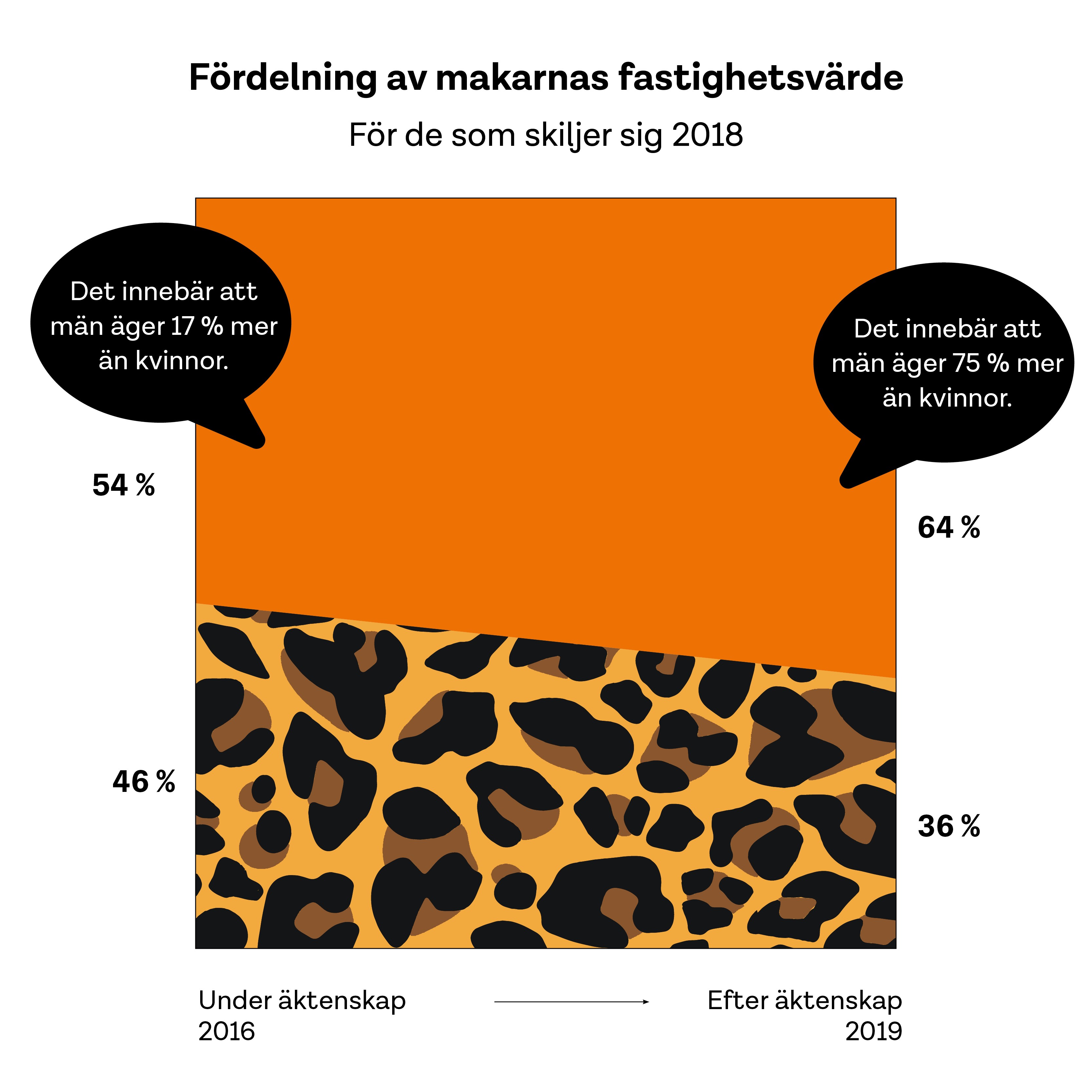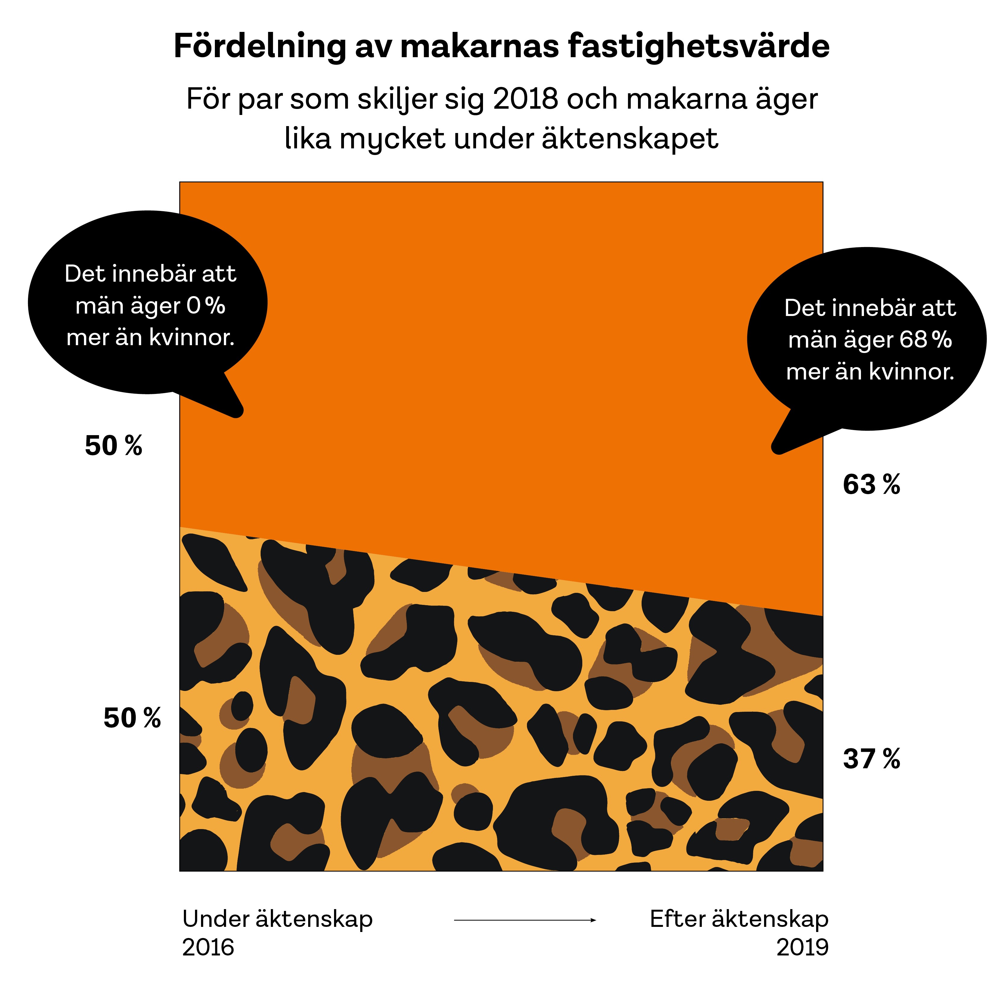 Bland par som är gifta 2016 och skiljer sig under 2018 äger män i genomsnitt 17 procent mer än kvinnor under äktenskapet. Efter skilsmässan ökar denna skillnad till att män äger 75 procent mer. Det innebär att skillnaden ett kalenderår efter skilsmässan är drygt 4 gånger så stor som under äktenskapets sista år.