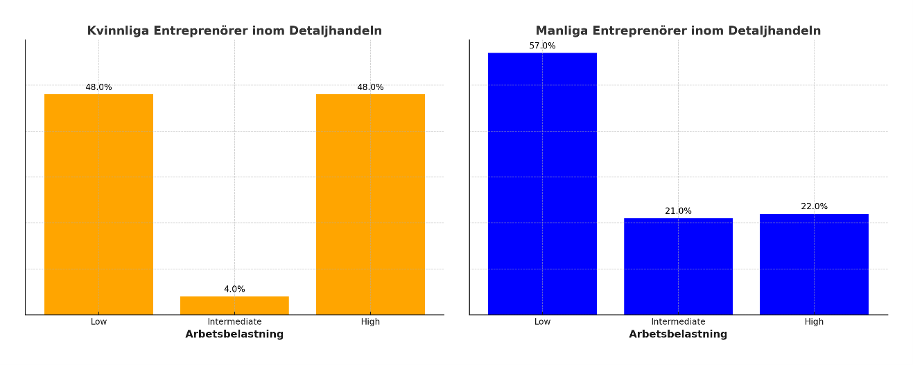 Data visar på en uttalad könsskillnad, där nästan hälften av de kvinnliga entreprenörerna inom detaljhandelssektorn rapporterar höga nivåer av utbrändhet, jämfört med bara en tredjedel av de manliga entreprenörerna (se figur 1). Intressant är att denna skillnad i utbrändhetsnivåer verkar vara specifik för kvinnliga entreprenörer inom detaljhandeln och inte gäller för manliga och kvinnliga anställda som arbetar under dessa entreprenörer.