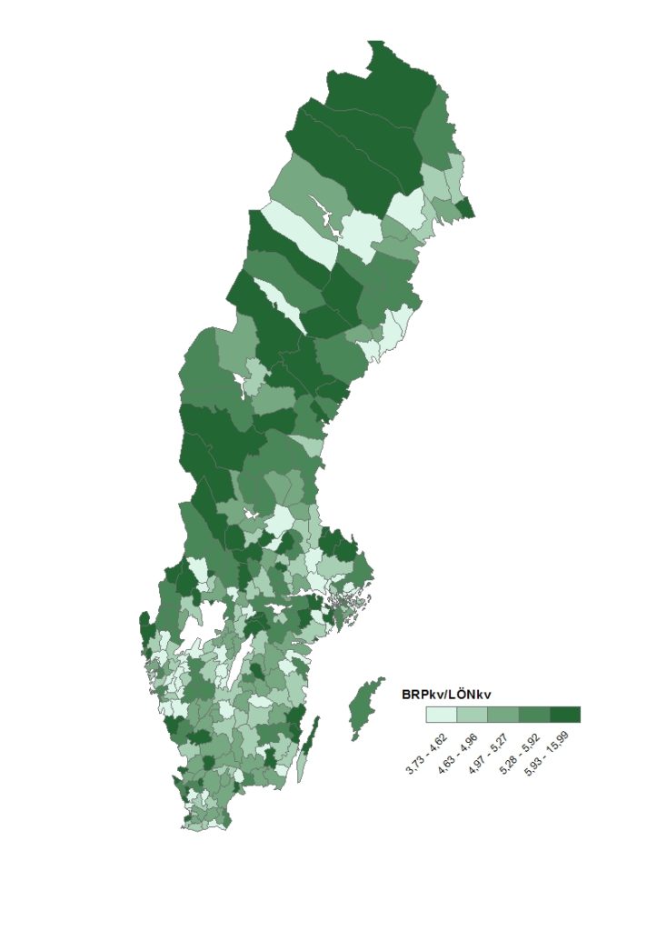 I kartan nedan sammanför vi produktionsperspektivet och marknadsperspektivet genom att vissa relationen mellan de båda i varje svensk kommun. Mörkare skuggning betyder att det är relativt stora produktionsvärden och relativt låga lönesummor och visar att de båda inte alltid sammanfaller geografiskt och att de inte heller behöver drivas av urbaniseringen. Ett sätt att tolka detta är att utifrån platsens perspektiv visa hur mycket förädlingsvärdena överstiger lönesummorna per capita. Lönesummorna är det som bildar det viktiga köpkraftsunderlaget för den lokala och regionala marknaden.