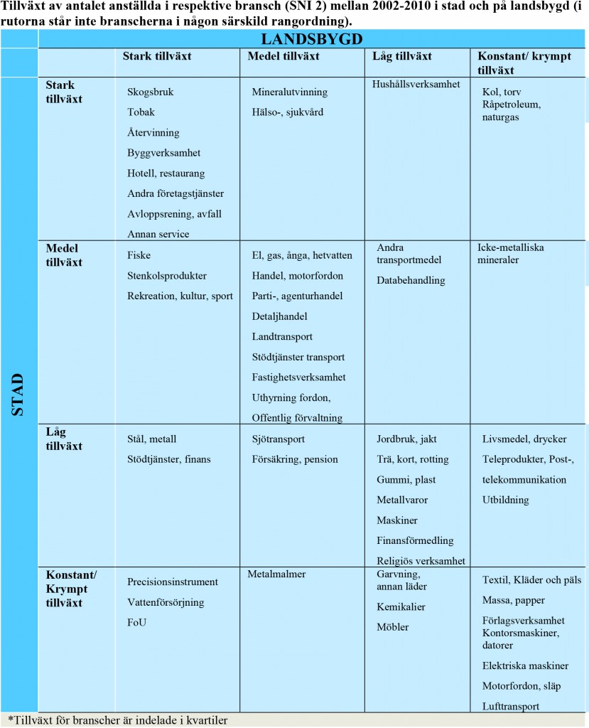 I tabellen nedan visar jag tillväxten i sysselsättning (antalet anställda) mellan 2002 och 2010. Tabellen ska läsas så att kolumnerna visar storlek på tillväxt i landsbygdskommuner medan raderna visar tillväxten i stadskommunerna. Storleken på tillväxten är indelad i stor, medel, liten och konstant/krympande. Som exempel kan vi se på branscherna i det övre vänstra hörnet (skogsbruk, tobak, återvinning etc.). Dessa visar sig ha haft en stark tillväxt i stadskommuner likväl som i landsbygdskommuner. Motsatt gäller då för de branscher som förlägger sig i det nedre högra hörnet som alla har haft en konstant eller krympande tillväxt i städer likväl som på landsbygder.