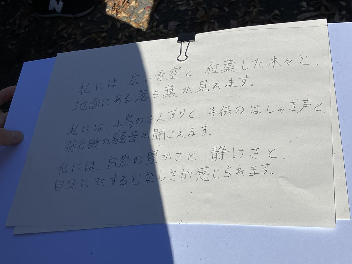 ABC mattan på hemmaplan blir ofta en ”plocka skräpmatta” såsom cigarettpaket på c, kapsyl på k, men i Japan finns inget skräp alls på marken. Det är väldigt svårt att hitta en skräpkorg överhuvudtaget i stads- och naturlandskapet. Så några kampanjer att inte skräpa ner är totalt överspelat. Jag frågar nyfiket hur det kommer sig att skräp och klotter inte alls existerar och lärarna blir förvånade över frågan. – Vi lär ju barnen att inte skräpa ner och vill de rita så får de använda papper … svårare än så är det inte. Väl inne i elevernas klassrum ska de skriva ner sina reflektioner utifrån utomhusundervisningen. Några elever tyckte det vara roligt, medan andra elever tyckte att man inte ska blanda ihop olika skolämnen med varandra [ämnesintegrerat lärande] utan är det matematikämnet så är det bara att räkna.