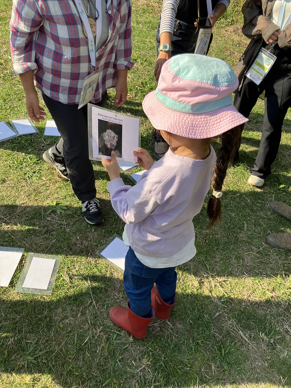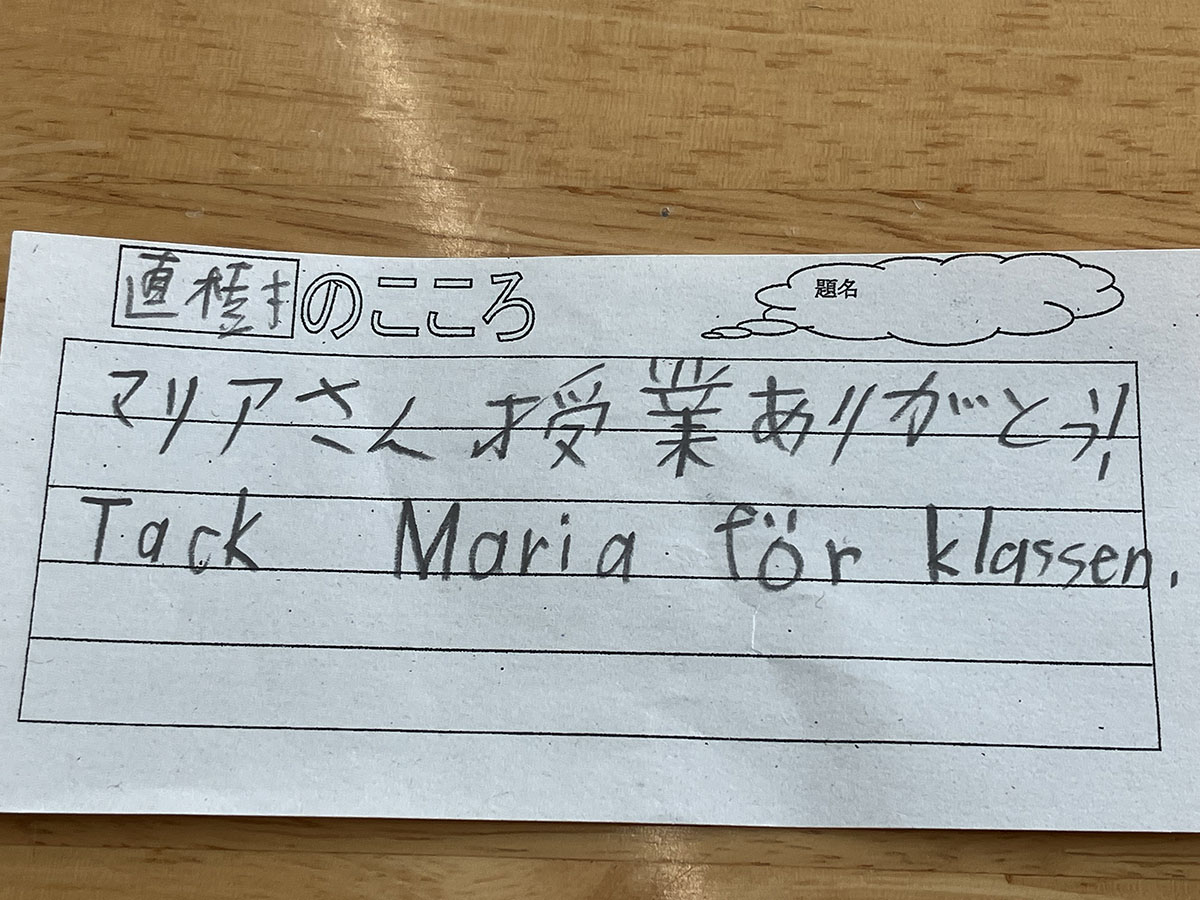 Regn? När det regnar är vi i Japan inte utomhus alls. Paraplyet som vi använder till och från skolan ställs i ett särskilt ställ utanför skolenheten och så får workshopen vara inomhus istället. Det blev att eleverna fick rita och skriva ner tänkbara naturföremål och fästa på bokstavsmattan. Som utomhuspedagog blev jag ganska förvånad, för det är väl bara att gå ut? Regnkläder ingår inte riktigt i den japanska repertoaren och inte heller devisen ”det finns inget dåligt väder – bara dåliga kläder”. Nåväl, förutom vissa elever så uppskattade klassläraren det pedagogiska inslaget och det fanns en vilja att studera lite mer om möjligheterna till en mer varierad undervisning.