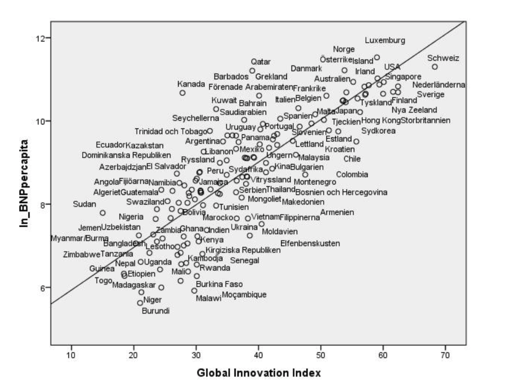 Sambandet mellan innovationer och tillväxt kan visas i ett enkelt punktdiagram. I figuren nedan mäts ett innovationsindex längs X-axeln. Detta index tas fram årligen av den internationella patentorganisationen WIPO samt de två handelshögskolorna INSEAD och Johnson Cornell University. I indexet har man vägt samman en mängd olika faktorer som länders företagsklimat, resurser som spenderas på forskning och utveckling, utbildningsnivå, patent o.s.v. så ju högre index ett land får, ju mer innovativt anses det vara. Längs Y-axeln mäts BNP per capita (invånare) i amerikanska dollar. Båda variablerna gäller för år 2015.