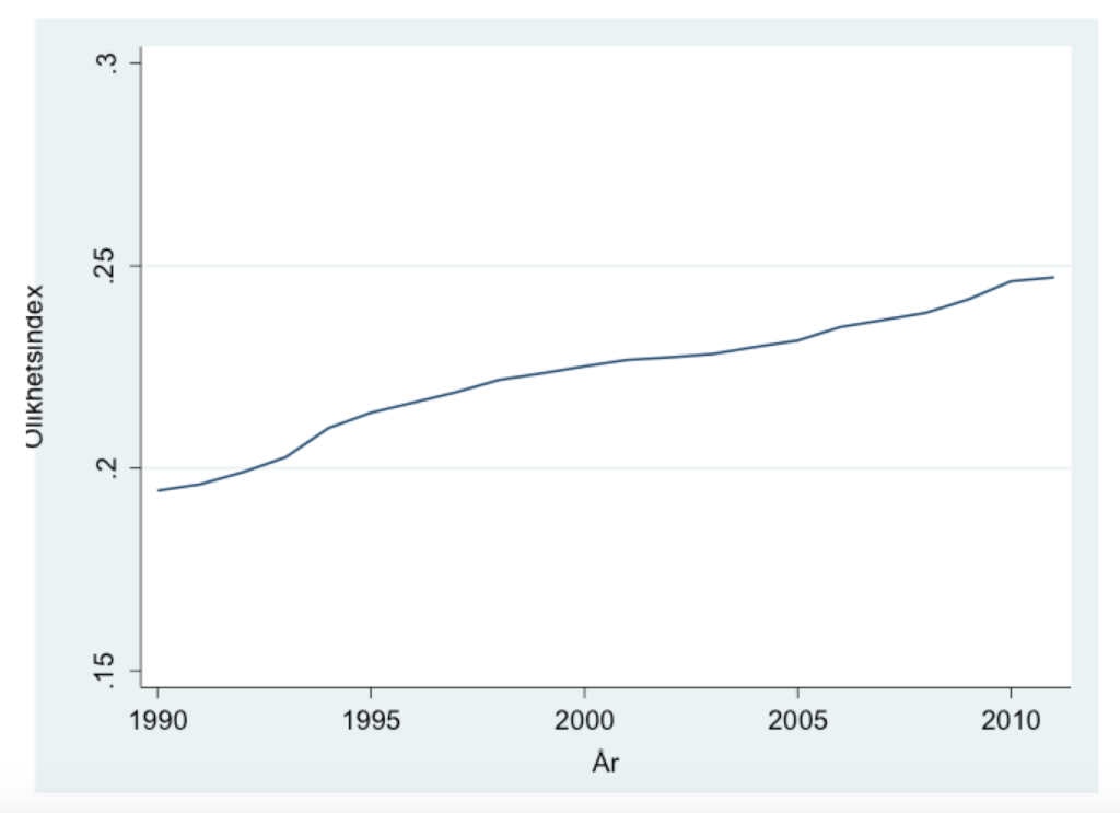 Genom att beräkna olikhetsindexet för varje region och varje år mellan 1990 och 2011 (vilket är den tidsperiod jag har data för i dagsläget), samt vikta indexet med regional befolkningsstorlek, är det möjligt att visa på den genomsnittliga utvecklingen av segregationen i Sverige. Figuren nedan ger en tydlig bild av att segregationen gradvis tilltar, över tidsperioden har olikhetsindexet stigit med cirka 5 procentenheter (0,1944 till 0,2471).