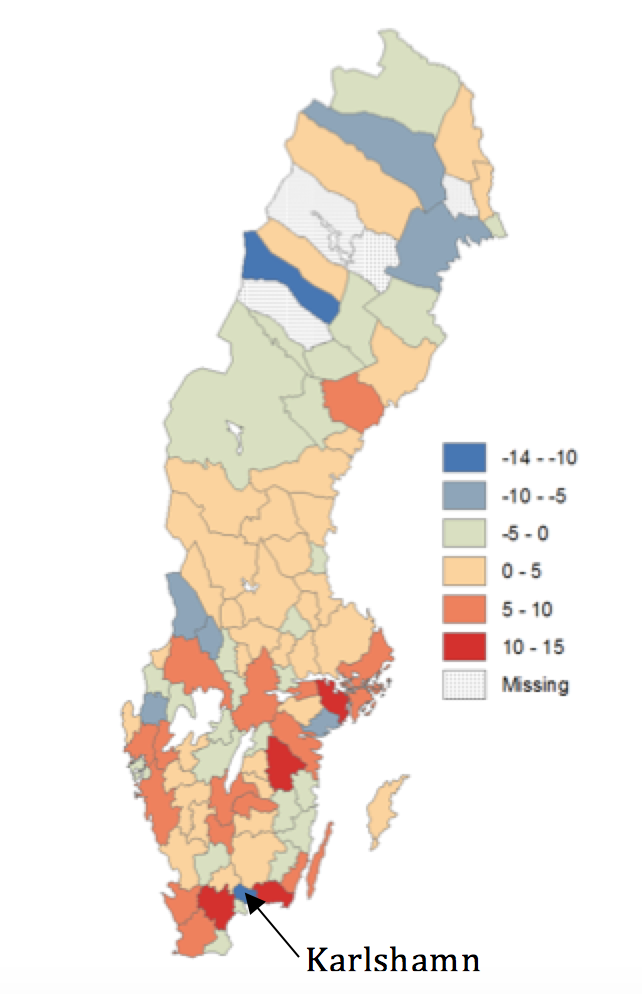 Dessutom ligger Karlshamn mitt emellan Karlskrona och Kristianstad, som har en helt motsatt utveckling. I dessa två arbetsmarknadsregioner har segregationen istället ökat kraftigt, endast Linköping har haft en större ökning sedan 1990. Detta kan sammanfattas i kartan nedan över Sveriges arbetsmarknadsregioner, vilken illustrerar förändringen i segregation i procentenheter mellan 1990 och 2011 (se tidigare blogginlägg för en förklaring av hur segregationen är beräknad).